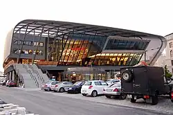 After a public tender by the city of Munich in 2002, the contract for the design was awarded to the architectural firm Auer+Weber+Assoziierte. The futuristic exterior façade is based on the shape of an ICE powerhead, which was to fit in with the redesign of Munich's main railway station discussed at the time. Almost 31 km of tubes were used for the aluminium tube design, which is unique in Germany.