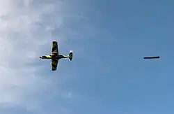 A C-3605 target tug has retracted the trailing target with the winch after its target flights.