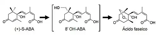 Generan ácido faseico y ácido dihidroxifaseico. Estos compuestos apenas poseen actividad. Se producen mediante la hidroxilación de la molécula de ABA en la posición C8' mediante monoxigenasas de tipo P-450 de la familia de CYP707A (ABA 8' hidroxilasas) para generar un intermediario inestable, el 8'-OH-ABA, que es isomerizado a ácido faseico. Aunque la 8' hidroxilación es la principal ruta catabólica, el ABA también puede ser hidroxilado en las posiciones 7' y 9'.[12] En la fase de rehidratación tras un estrés hídrico se ha visto que mientras que los niveles de ABA disminuyen, los de ácido faseico aumentan.