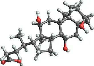 - Su fórmula lineal simplificada es :C[C@@]34[C@] (CC[C@@H]4[C@@H] (CCC(O)=O)C) ([H])[C@]2([H]) [C@H](O)C[C@]1 ([H])C[C@H](O) CC[C@@](C)1[C@] ([H])2C[C@@H]3O