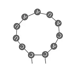 La interacción por puentes de hidrógeno descrita por Watson y Crick[20] forma pares de bases entre una purina y una pirimidina. A este patrón se le conoce como apareamiento Watson y Crick. En este, la adenina se aparea con el uracilo (timina, en ADN) y la citosina con la guanina. Sin embargo, en el ARN se presentan muchas otras formas de apareamiento, de las cuales la más ubicua es el apareamiento wobble (también apareamiento por balanceo o apareamiento titubeante) para la pareja G-U. Este fue propuesto por primera vez por Crick para explicar el apareamiento codón-anticodón en los ARNt y ha sido confirmado en casi todas las clases de ARN en los tres dominios filogenéticos.[21]