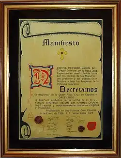 - ↑ Imagen del Pergamino del Manifiesto Fundacional de la Orden Rosacruz en el presente ciclo de manifestación