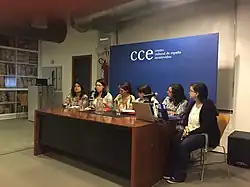 ![]() Ángela López Ruiz (quinta posición desde la izquierda), el 16 de mayo de 2018, en actividad desarrollada en el Centro Cultural de España en Montevideo. | ||