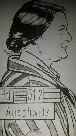 ![]() Dibujo basado en una de las fotografías tomadas a Ángela al llegar al campo de concentración. | |||