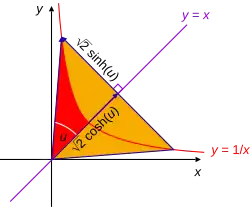La magnitud del ángulo hiperbólico es el área del sector hiperbólico correspondiente que vale ln x.