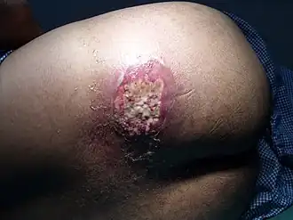 El ántrax es una infección cutánea por estafilococos formada por una agrupación de forúnculos con extensión de la infección al tejido subcutáneo.[1][2] Las lesiones presentan supuración profunda, son de lenta curación y producen cicatrices. En ocasiones, por influencia del inglés, se utiliza erróneamente el término «ántrax» para referirse al carbunco;[nota 1] las dos enfermedades tienen en común las lesiones cutáneas como síntoma, sin embargo, al contrario que el ántrax de origen foruncular, las úlceras causadas por el carbunco suelen ser indoloras.[5]