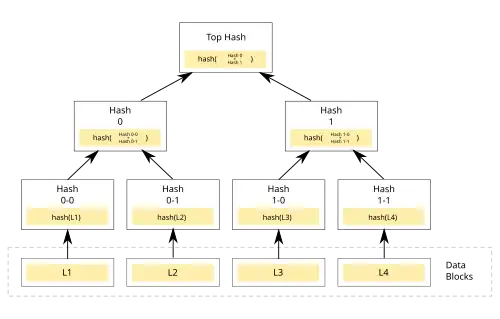 Permite que gran número de datos separados puedan ser ligados a un único valor de hash, el hash del nodo raíz del árbol. De esta forma proporciona un método de verificación segura y eficiente de los contenidos de grandes estructuras de datos. En sus aplicaciones prácticas, normalmente el hash del nodo raíz va firmado para asegurar su integridad y que la verificación sea totalmente fiable. La demostración de que un nodo hoja es parte de un árbol hash dado requiere una cantidad de datos proporcional al logaritmo del número de nodos del árbol.