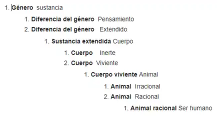 El ejemplo nos muestra cómo el esquema va dividiendo cada género en dos opciones, las cuales van dirigiéndose a la especie más baja, describiendo al ser humano de esta manera como una sustancia extendida, lo que implica que posee un cuerpo. Este cuerpo está vivo, lo cual implica que es un animal. Este animal tiene la característica de ser racional.