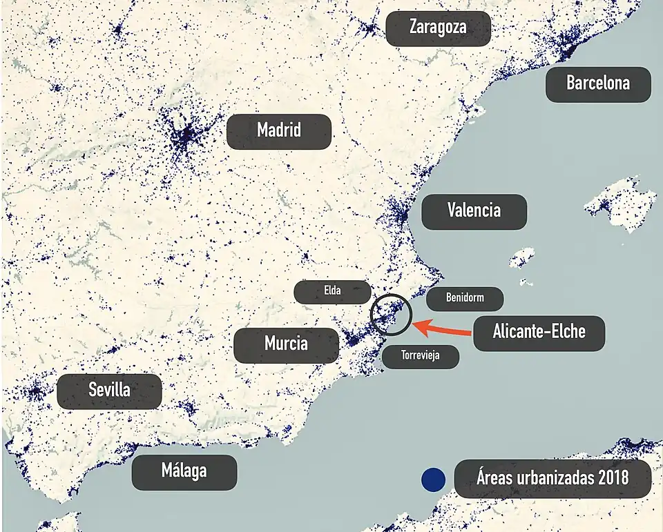 | Área urbana de Elche | 358.620 | 4.827 | 60.358 | 353.793 | 293.435 |