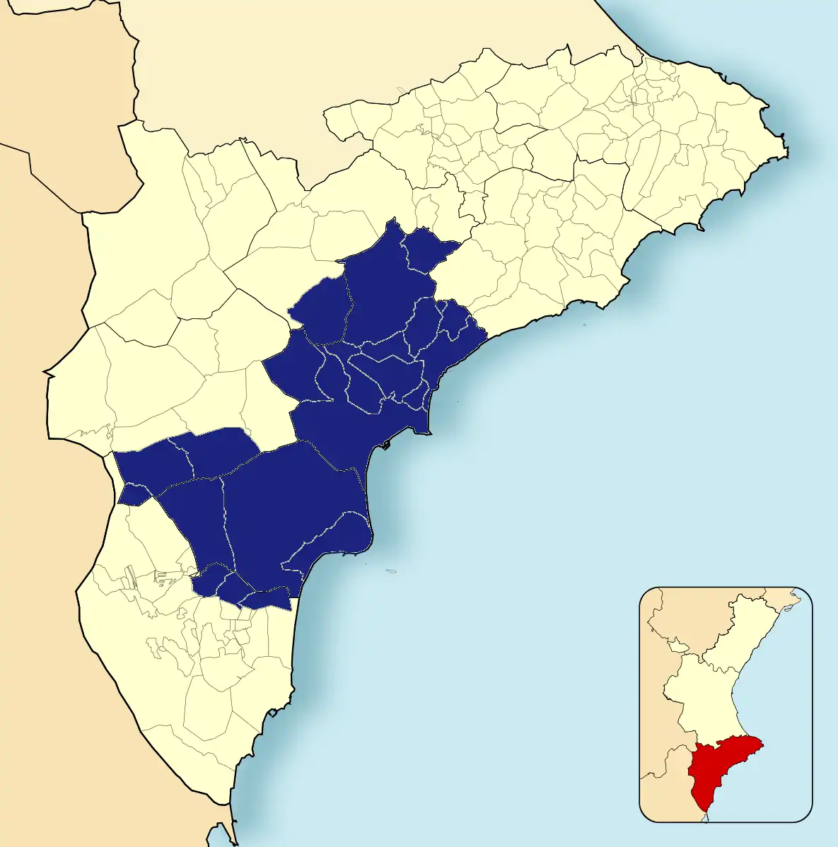 Está localizada al sur de la Comunidad Valenciana, en el sudeste de España y se caracteriza por una fuerte expansión urbanística y crecimiento poblacional durante las últimas décadas.