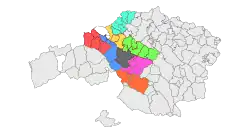 - ↑ a b c d Estos municipios oficialmente están ubicados en la comarca de la Margen Derecha, sin embargo geográficamente y popularmente se encuentran ubicados en el Valle de Asúa (ver Gran Bilbao).