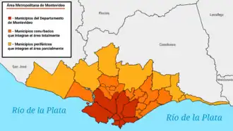 Desde el punto de vista estrictamente administrativo, el área metropolitana abarca todo el territorio del departamento de Montevideo, la totalidad de trece municipios de Canelones y otros ocho parcialmente; junto al municipio de Ciudad del Plata y parcialmente el de Libertad, en el departamento de San José.