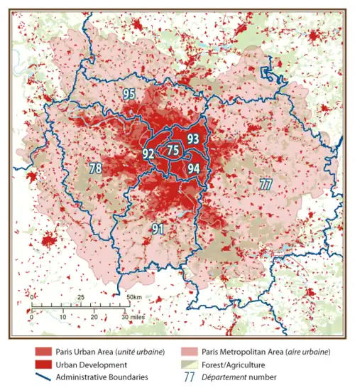 Según el censo de 1999, el área metropolitana de París era un poco más grande que la Isla de Francia y tenía 11 174 743 habitantes en 14 518 km². En la revisión de 2010, el área urbana de París tenía 1751 municipios.[17]