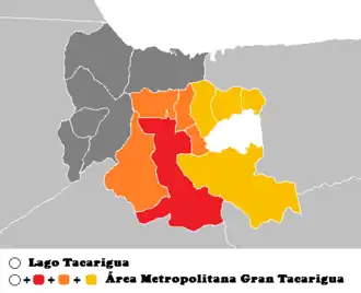 El Área Metropolitana de Valencia o Gran Tacarigua corresponde a todas las entidades, poblaciones y ciudades en torno al Lago Tacarigua o de Valencia, siendo conformada por 9 Municipios Autónomos del Estado Carabobo: 5 Municipios de los que integran la Ciudad de Valencia[4] a los cual cuales se les adicional otros 4 Municipios de la entidad carabobeña para formar el Área Metropolitana de Valencia[3] En total suman 23 Parroquias, y acorde a las proyecciones de población OCEI para el 2020 la demografía es:
