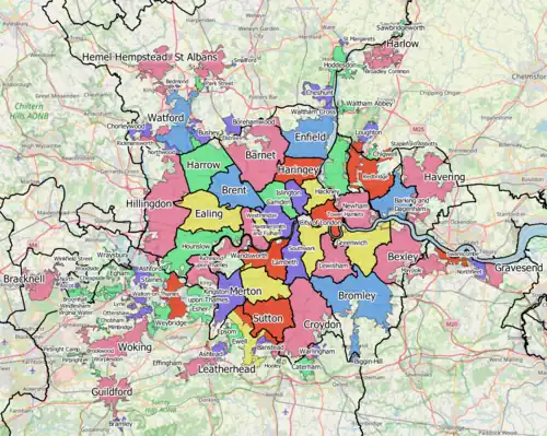 Dentro de la región, había 33 componentes correspondientes a la City de Londres y los municipios de Londres. Sin embargo, los límites de la ONS no son idénticos a los de las autoridades locales, y áreas periféricas como Biggin Hill en Bromley quedan excluidas.[13]