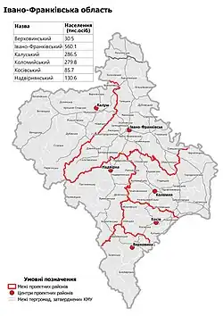 El centro administrativo de la óblast de Ivano-Frankivsk es la ciudad de Ivano-Frankivsk.[17]