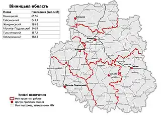 El óblast de Vínnitsa fue subdividida administrativamente hasta 2020 en 27 raiones, junto con 6 ciudades ciudades de importancia regional que están directamente subordinadas al óblast: Jmílnyk, Koziatyn, Ladyzhyn, Mohyliv-Podilski, Zhmérynka, así como el centro administrativo de la óblast, Vínnitsa.