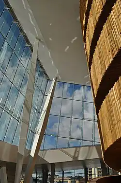 El vestíbulo está rodeado por ventanas de 15 m (49 pies) de altura con marcos mínimos y vidrios especiales que permiten vistas máximas del agua.[16] El techo está sostenido por delgadas columnas en ángulo también diseñadas para no interferir con las vistas.[16]