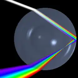 2. Los prismas dispersivos son usados para descomponer la luz en el espectro del arcoíris, porque el índice de refracción depende de la frecuencia (ver dispersión); la luz blanca entrando al prisma es una mezcla de diferentes frecuencias y cada una se desvía de manera diferente. La luz azul es disminuida a menor velocidad que la luz roja.