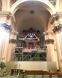 La plataforma fue ampliada, mediante una viga estructural, indispensable para mover aproximadamente 70 cm hacia adelante el mueble original del instrumento, intervención que se hizo para darle al órgano mayor importancia estética, e igualmente mejorar la calidad sonora, incorporando sobre un voladizo de la viga, un mueble a modo de cadereta[n. 1] que alberga nuevos registros del positivo.[2]