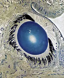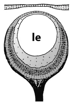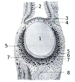 ![]() 1 - cristalino 2 - epitelio olfativo 3 - epitelio corneal 4 - endotelio corneal 5 - retina 6 - capa con bastoncillos 7 - capa de tejido conectivo fibroso 8 - nervio ocular |