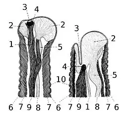 ![]() 1 - nervio del ojo 2 - 3 - 4 - ojo 5 - ganglio del tentáculo 6 - epidermis 7 - 8 - nervio de un tentáculo 9 - músculo retractor 10 - |
