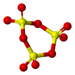 La naturaleza del sólido SO3, es una sorprendente área compleja porque su estructura cambia debido a trazas de agua.[2] En la condensación del gas absolutamente puro, el óxido de azufre(VI) condensa en un trímero llamado γ-SO3. Esta forma molecular es un sólido sin color con un punto de fusión de 16.8 °C y adopta una estructura cíclica descrita como [S(=O)2(μ-O)]3.[3]