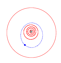 ![]() Órbita de Myriostos (en azul) alrededor del Sol (en negro). En rojo, las órbitas de los planetas, siendo la más exterior la de Júpiter. | ||