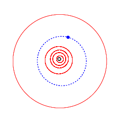 ![]() Órbita de Brachiosaurus (en azul) alrededor del Sol (en negro). En rojo, las órbitas de los planetas, siendo la más exterior la de Júpiter. | ||