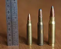 (25 Remington) (center) with 223 Rem (left) and 308 Wim (right).