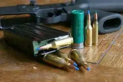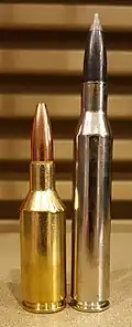 ![]() 25 WSSM cargados en una cacerina de AR-15. Al lado un cartucho 12 y un .223 Remington | ||||||||||||||||||||||||||