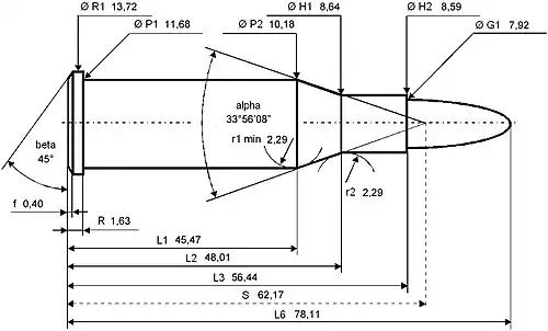 - Estándar: Bala de 11,3 g, una camisa de CuNi y un núcleo compuesto por aluminio/plomo. Fulminante pintado de color negro.