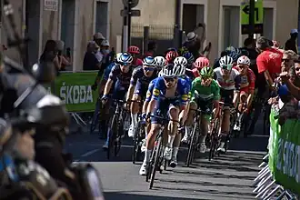 | El pelotón a 1 km de la línea de meta durante la 13.ª etapa |