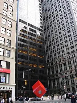 La escultura se tituló El Cubo (en inglés, The Cube) y se instaló en 1968. Es un romboedro de color bermellón con un agujero cilíndrico en el centro, de pie sobre una esquina y que mide 8,5 m alto.[30][31] El Cubo está ubicado fuera del centro, en el lado norte de la plaza, contrastando con la fachada oscura de 140 Broadway mientras dirige la atención de los espectadores hacia la plaza circundante.[32] Al igual que 140 Broadway, fue detallado por SOM y tiene un marco de aluminio.[33] Bunshaft elogió a El Cubo por "funcionar maravillosamente con el edificio [en] todos los sentidos",[34] mientras que el director del Museo Metropolitano de Arte, Thomas Hoving, dijo que el cubo era una señal de "cambio en el gusto del público".[35]