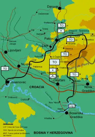 - ↑ a b c d Čubrić, Jovan (6 de julio de 1992). «Izvješće Zonskog štaba TO Zapadna Slavonija Glavnom štabu TO RSK o izvršenoj demobilizaciji jedinica, rajonima razmještaja PJM, te razmještaju snaga UNPROFOR-a» [Informe del comando TO Slavonia occidental sobre desmovilización de unidades, áreas de despliegue de Polcía y despliegue de fuerzas de UNPROFOR]. edoc.site (en serbocroata). Okučani. p. 39. Consultado el 13 de octubre de 2018. «Documento Nro 21».