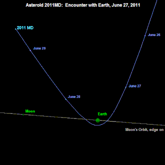 El asteroide 2011 MD, descubierto el 22 de junio de 2011 por el Licoln Near Earth Asteroid Research Program (LINEAR), pasó a las 17 horas GMT (Greenwich Mean Time) del 27 de junio de 2011 a alrededor de 12 000 km de distancia de la superficie terrestre, aproximadamente 32 veces más cerca que la Luna.[1] Las dimensiones del asteroide se estiman entre 10 y 30 metros.[2] Según otra fuente podría estar entre 8 y 18 m.[3][4]