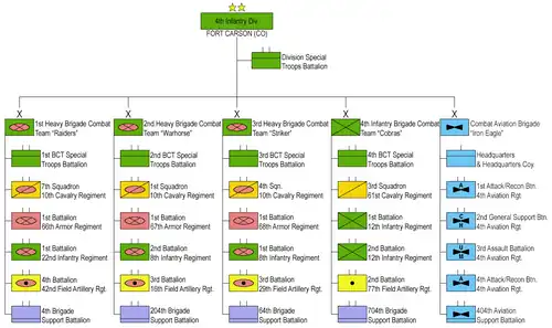 A su regreso de Irak, la 4.ª División inmediatamente comenzó la reorganización hacia el nuevo sistema de estructuración del Ejército de los Estados Unidos, la llamada brigada modular.