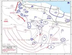 Al final de abril, la 150.ª Brigada fue movilizada al sur para relevar a la 201.ª Brigada de Guardias Motorizados en una gran caja con un perímetro de 20 millas (32 km), 6 millas (9.7 km) de la 69.ª Brigada al norte y 10 millas (16 km) del Free French al sur.