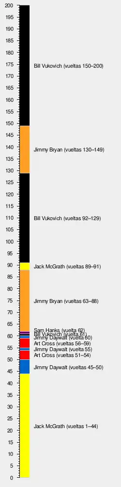 | Piloto Ganador | Fabricante Ganador | Promedio de Velocidad de competencia | Pole Position | Mayor Número de vueltas registradas como Líder |
