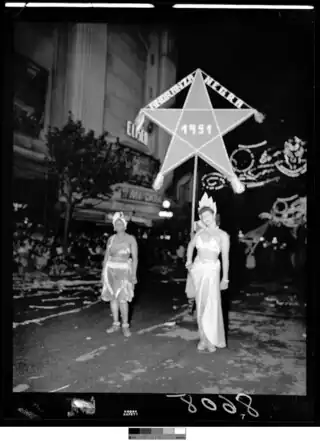 La vedette de candombe Martha Gularte en el desfile de carnaval de 1950 en Montevideo.
