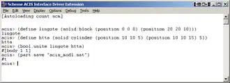 Scheme AIDE es un programa tipo TUI (Text-based User Interface) que accepta comandos en Scheme y muestra los resultados en una ventana separada, estos comandos pueden ser instrucciones nativas en Scheme o extensiones Scheme para la manipulación de ACIS.