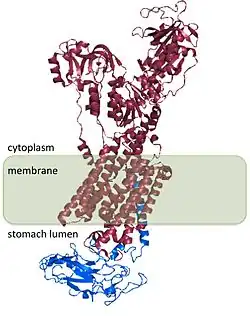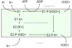 La ATPasa H+/K+ es una ATPasa de tipo P2, miembro de la clase eucariótica de las ATPasas de tipo P.[5] Al igual que las ATPasas Ca2+ y Na+/K+, la ATPasa H+/K+ funciona como un protómero α, β.[6] A diferencia de otras ATPasas eucarióticas, la H+/K+ es electroneutra, ya que transporta un protón al lumen estomacal por cada potasio que obtiene del mismo.[5] A modo de una bomba de iones, la ATPasa H+/K+ puede transportar iones en sentido contrario al que impone el gradiente de concentración utilizando para ello la energía obtenida de la hidrólisis del ATP. Al igual que en todas las ATPasas de tipo P, durante el ciclo de transporte se transfiere un grupo fosfato desde el trifosfato de adenosina (ATP) hacia la ATPasa H+/K+. Este transferencia de fosfatos produce un cambio en la conformación de la enzima que coadyuva el transporte de los iones.