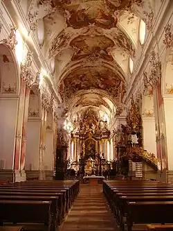 El interior presenta obras de estuco y frescos en estilo barroco tardío/rococó temprano de los miembros de la Escuela Wessobrunner. El pintor principal fue Matthäus Günther. La historia de San Benito destaca en los frescos.[1] : 83