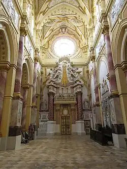 El interior de la iglesia se modificó a finales del siglo XVIII, en estilo neoclásico francés. Materno Bossi Creó los diseños de estuco. Se añadieron columnas corintias, un umbral neoclásico y se cubrió la bóveda gótica con guirnaldas de estuco. Las paredes y el techo se cubrieron de estuco blanco y amarillo. Los relieves de estuco muestran escenas de la vida de Jesús (nave) y de la vida de Bernardo de Claraval (coro). Las pinturas al óleo en las paredes de los pasillos laterales muestran a santos o miembros beatificados de la orden cisterciense.[1]: 241