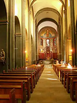 La nave central respeta el sistema obligado de un espacio por cada arco de la nave, así como por cada nave lateral. Posee una cúpula vaída (con base cuadrada) y sin nervaduras, como en Espira, una bóveda de cañón y lunetas. Tiene además pilastras con semicolumnas que llevan –junto a las nervaduras– capiteles que destacan en el conjunto por el uso de colores vivos. También los detalles de las pilastras en los arcos llevan delicadas cornisas coloreadas como los demás elementos arquitectónicos.