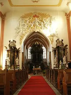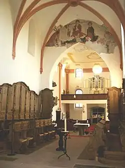 La abadía de Schönau se había vuelto lo suficientemente fuerte económicamente como para que en 1340 la ciudad de Frankfurt am Main pudiera prometer apoyo a través de armas y carros. Entre 1420 y 1430 se añadieron en el lado norte de la nave un presbiterio gótico (todavía existente) y una capilla dedicada a Santa Isabel.