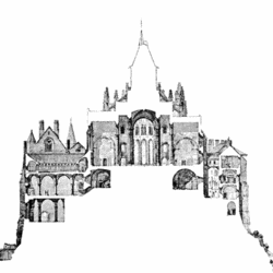 La abadía de Mont Saint-Michel se divide en dos partes: la iglesia abacial y la «Marvelle», es decir, la zona donde vivían los monjes. Vista desde el exterior, en su lado norte, se observa la fachada, que corresponde a la parte gótica. Tiene tres plantas y su construcción se prolongó durante 25 años.