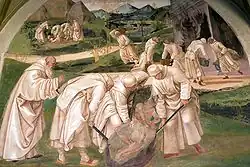 La disposición de los frescos sigue el relato de san Gregorio sobre la vida de Benedicto. Las pinturas de Signorelli se ejecutaron en 1497-98, mientras que las de il Sodoma se completaron después de 1505.