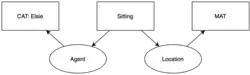 El gráfico 1 detalla algunas relaciones explícitas entre los objetos del diagrama. Por ejemplo, la flecha entre el agente y CAT:Elsie representa un ejemplo de una relación de es-a, al igual que la flecha entre el lugar y el MAT. Las flechas entre el gerundio/participio presente SENTADO y los sustantivoss agente y ubicación expresan la relación básica del diagrama; el agente está SENTADO en la ubicación; Elsie es una instancia de GATO.[7]