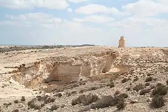 Una serie de tumbas y los restos de un templo se encuentran en la cresta de una piedra kurkar, situada entre el lago y el mar.